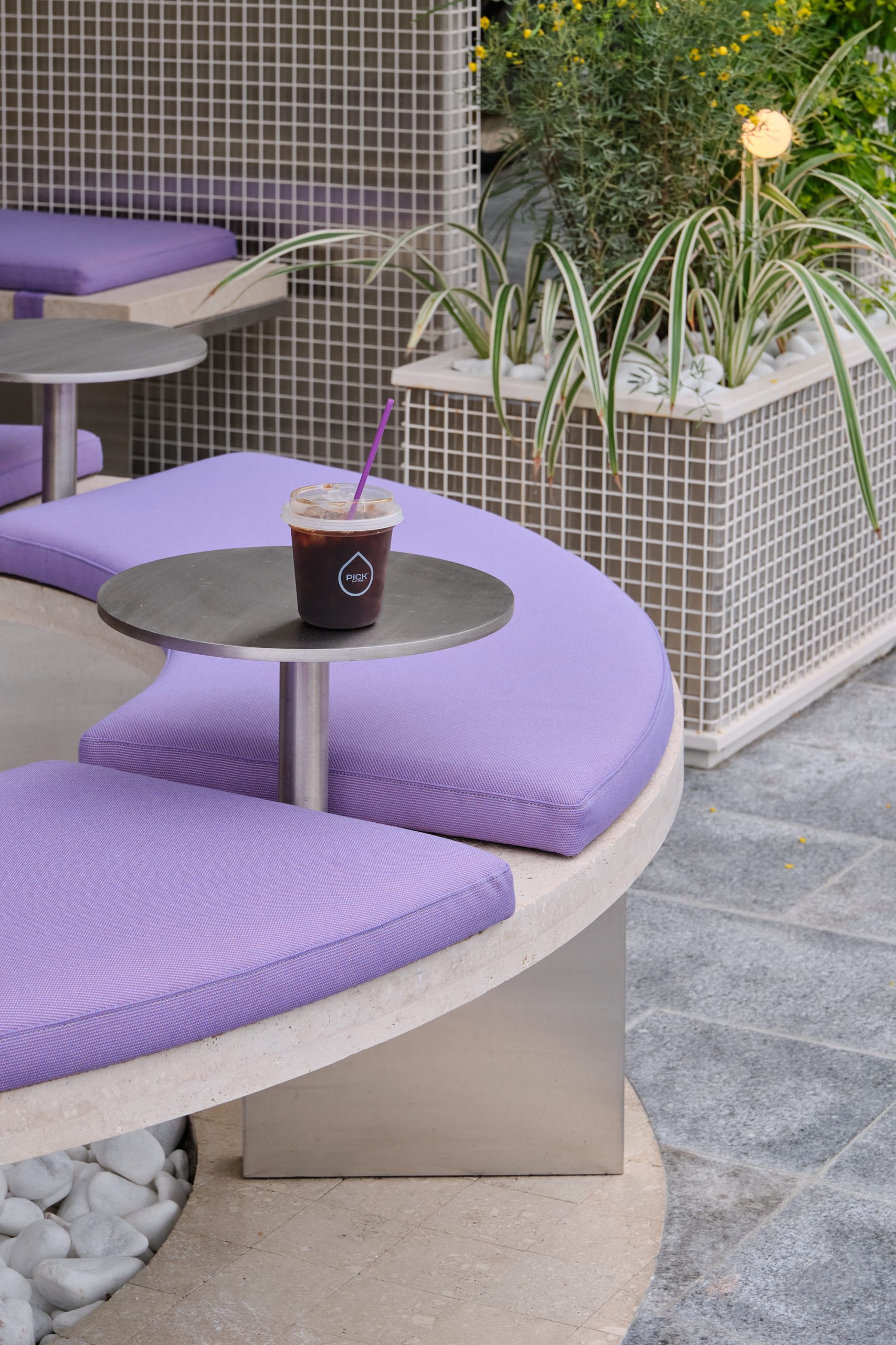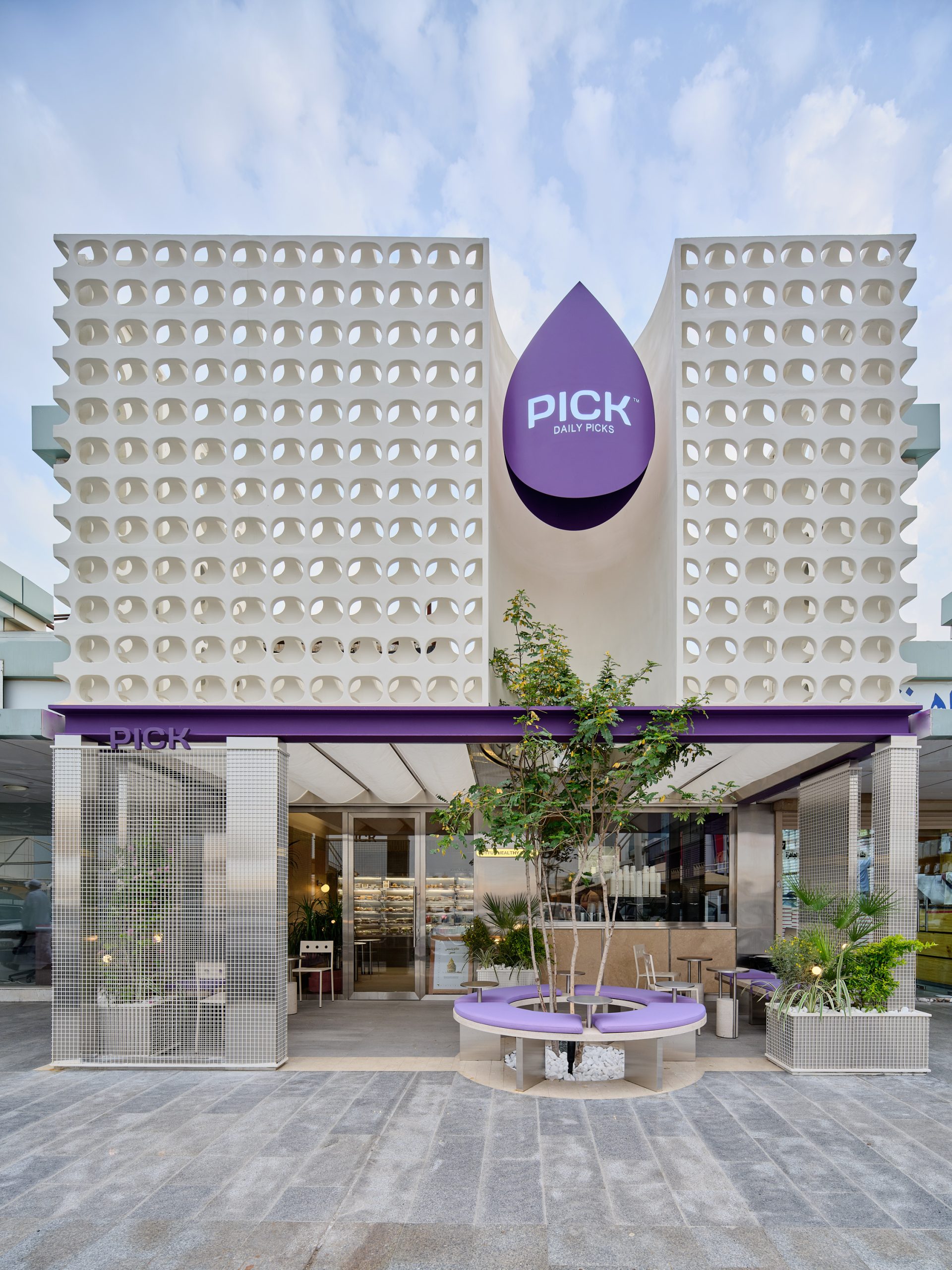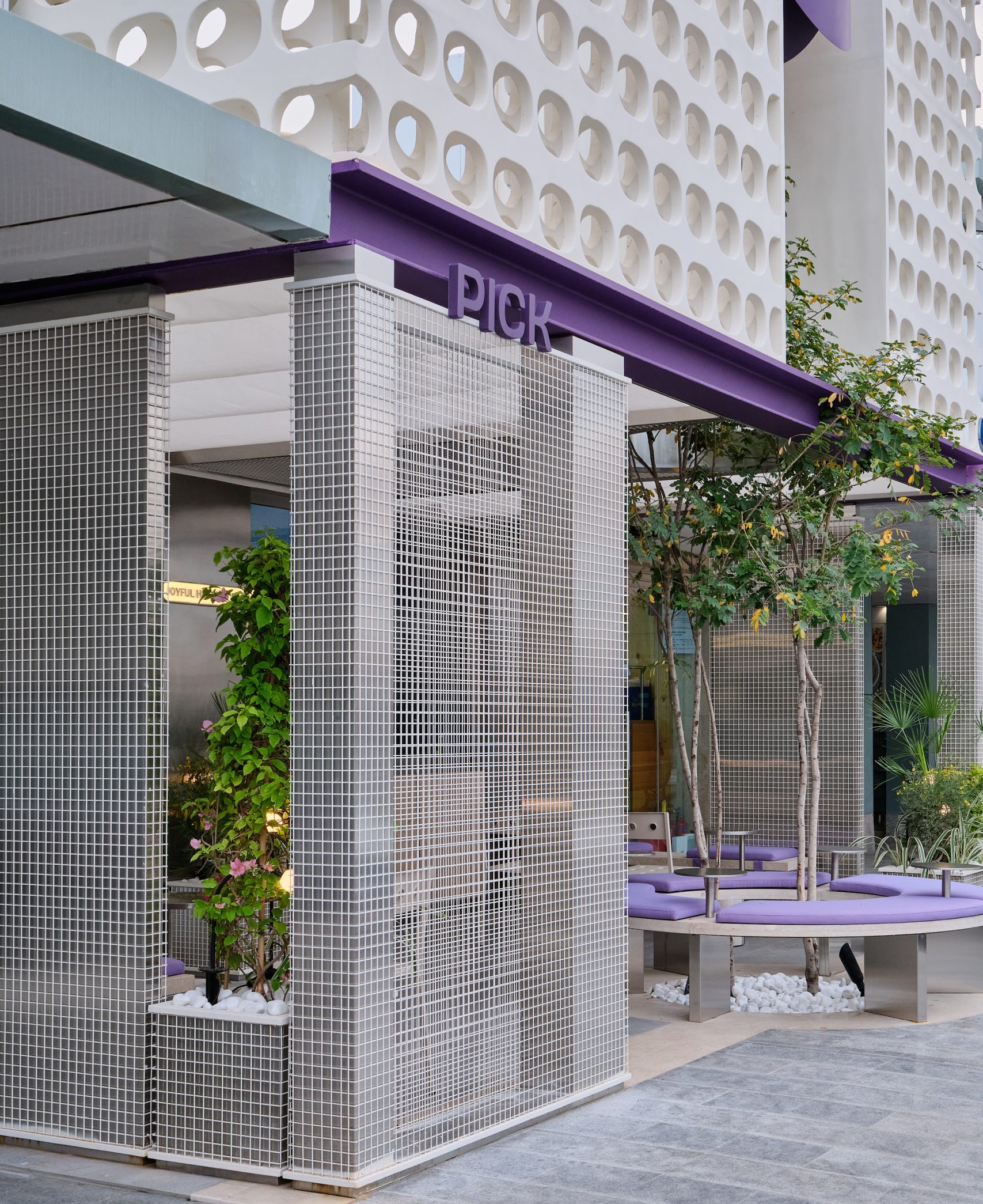 The custom GRC facade becomes the project’s defining element. Its repetitive perforated pattern forms a strong visual identity, interrupted by a central vertical void that frames a tall tree emerging through the architecture. This gesture transforms the entrance into a small urban pocket, softening the boundary between exterior and interior while introducing greenery as part of the experience.The outdoor area extends this idea. A circular seating element wraps around the tree, finished in soft lavender upholstery that is inspired by PICK’s signature purple color. Integrated steel tables support quick, informal use, while stainless steel columns and planted edges define the space and create a calm, shaded setting.