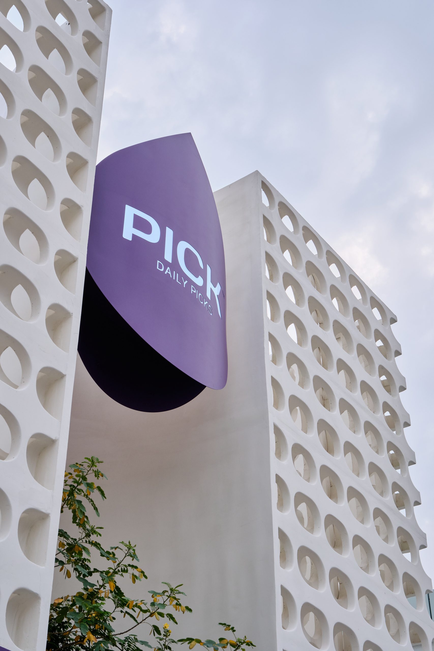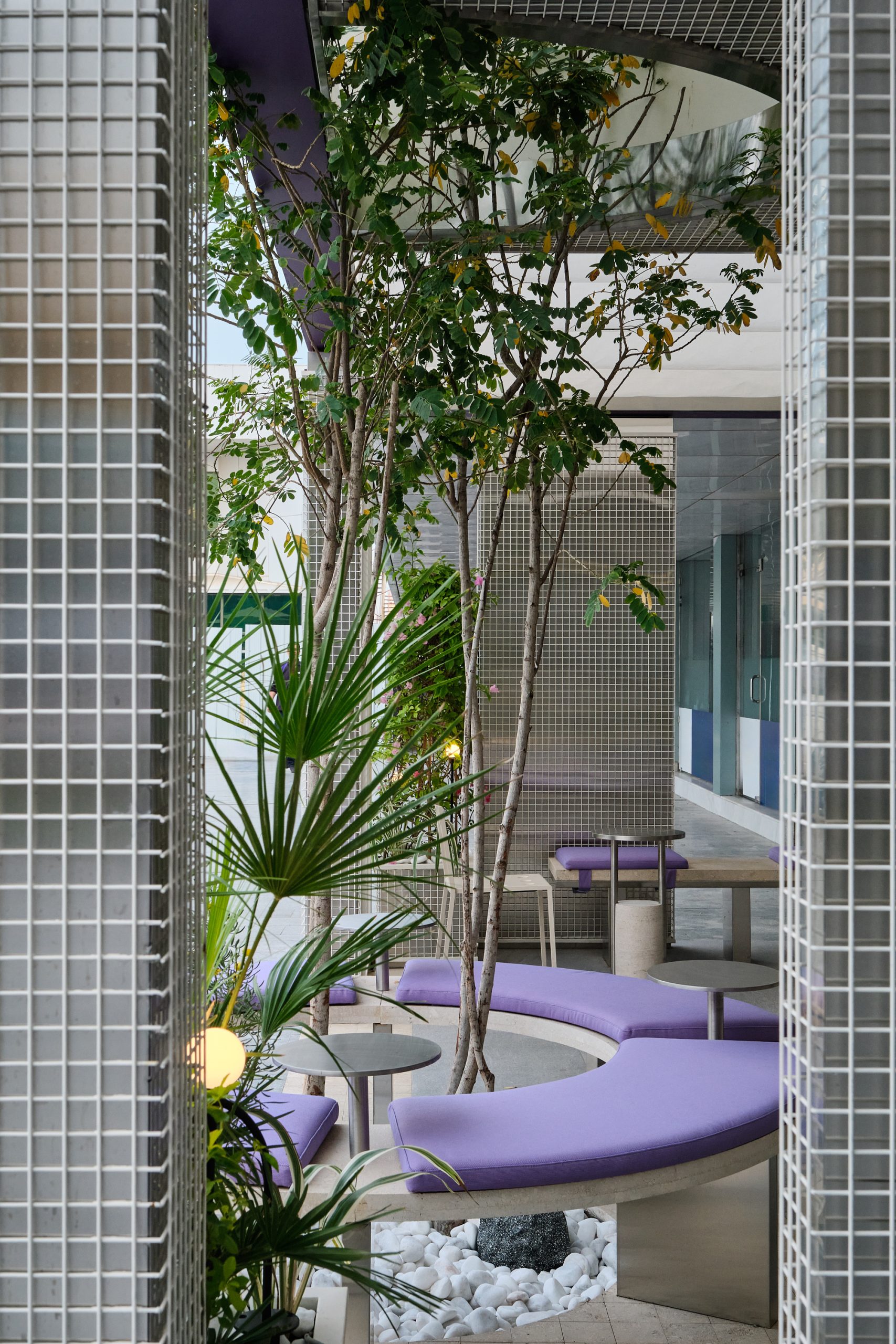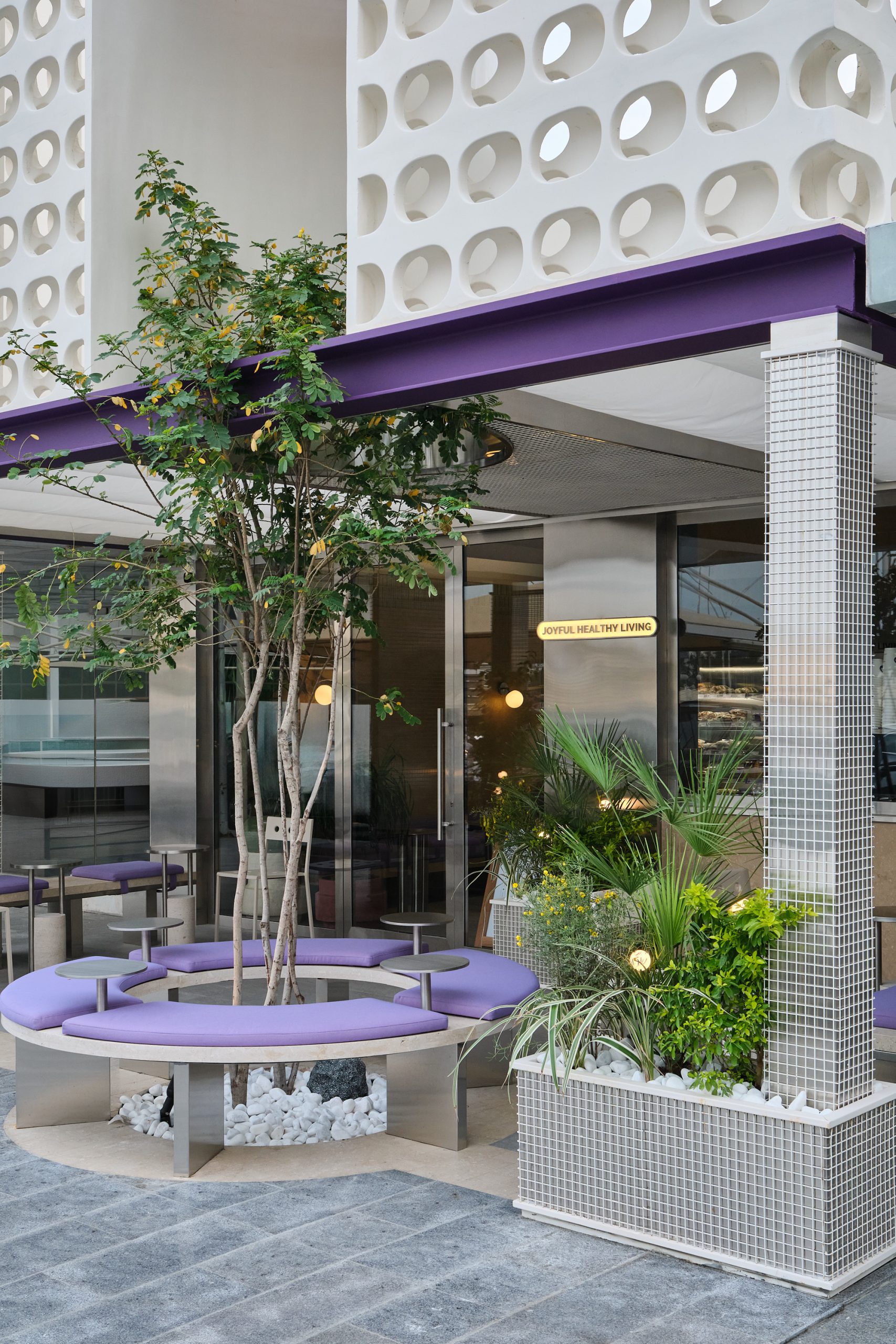 The custom GRC facade becomes the project’s defining element. Its repetitive perforated pattern forms a strong visual identity, interrupted by a central vertical void that frames a tall tree emerging through the architecture. This gesture transforms the entrance into a small urban pocket, softening the boundary between exterior and interior while introducing greenery as part of the experience.The outdoor area extends this idea. A circular seating element wraps around the tree, finished in soft lavender upholstery that is inspired by PICK’s signature purple color. Integrated steel tables support quick, informal use, while stainless steel columns and planted edges define the space and create a calm, shaded setting.