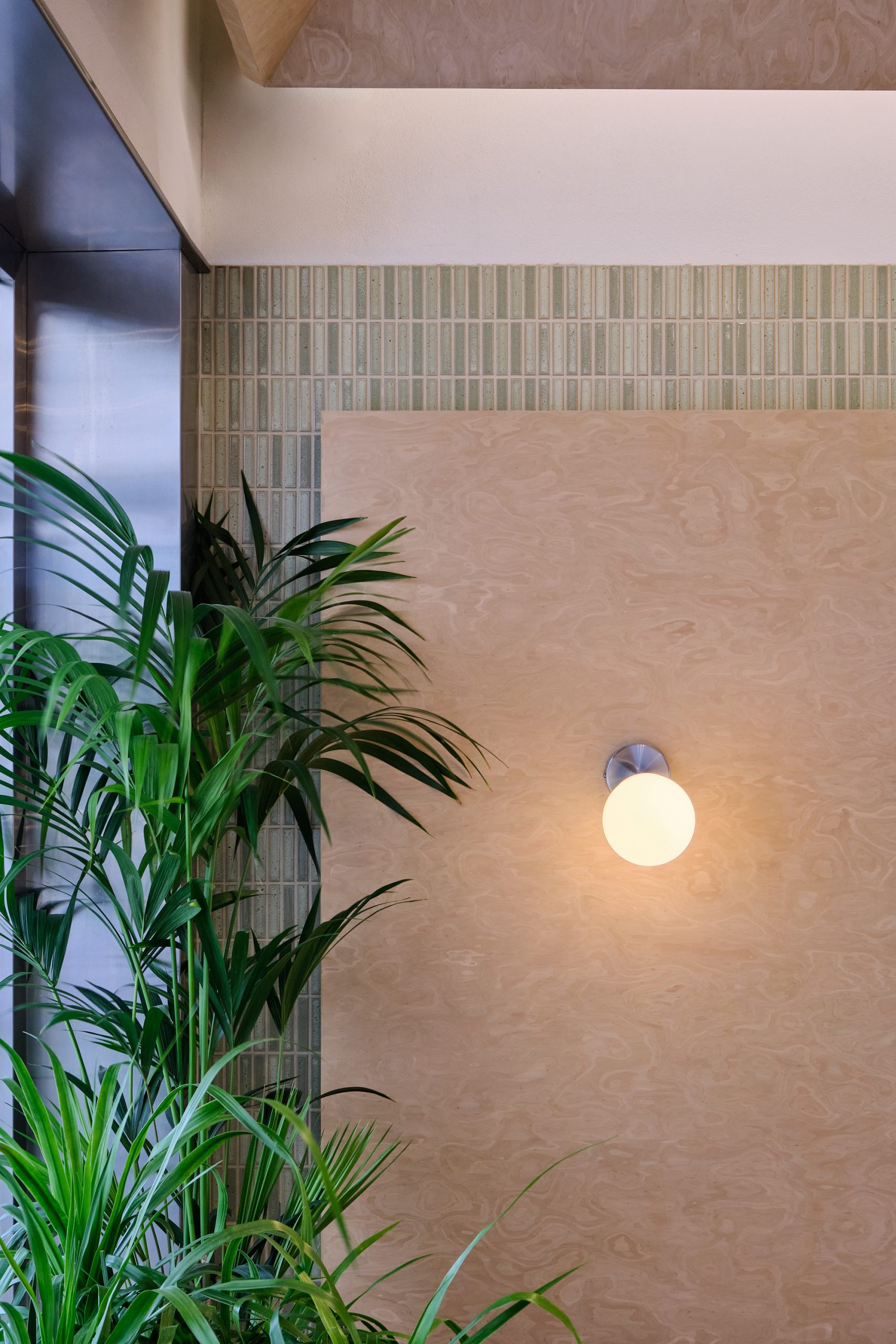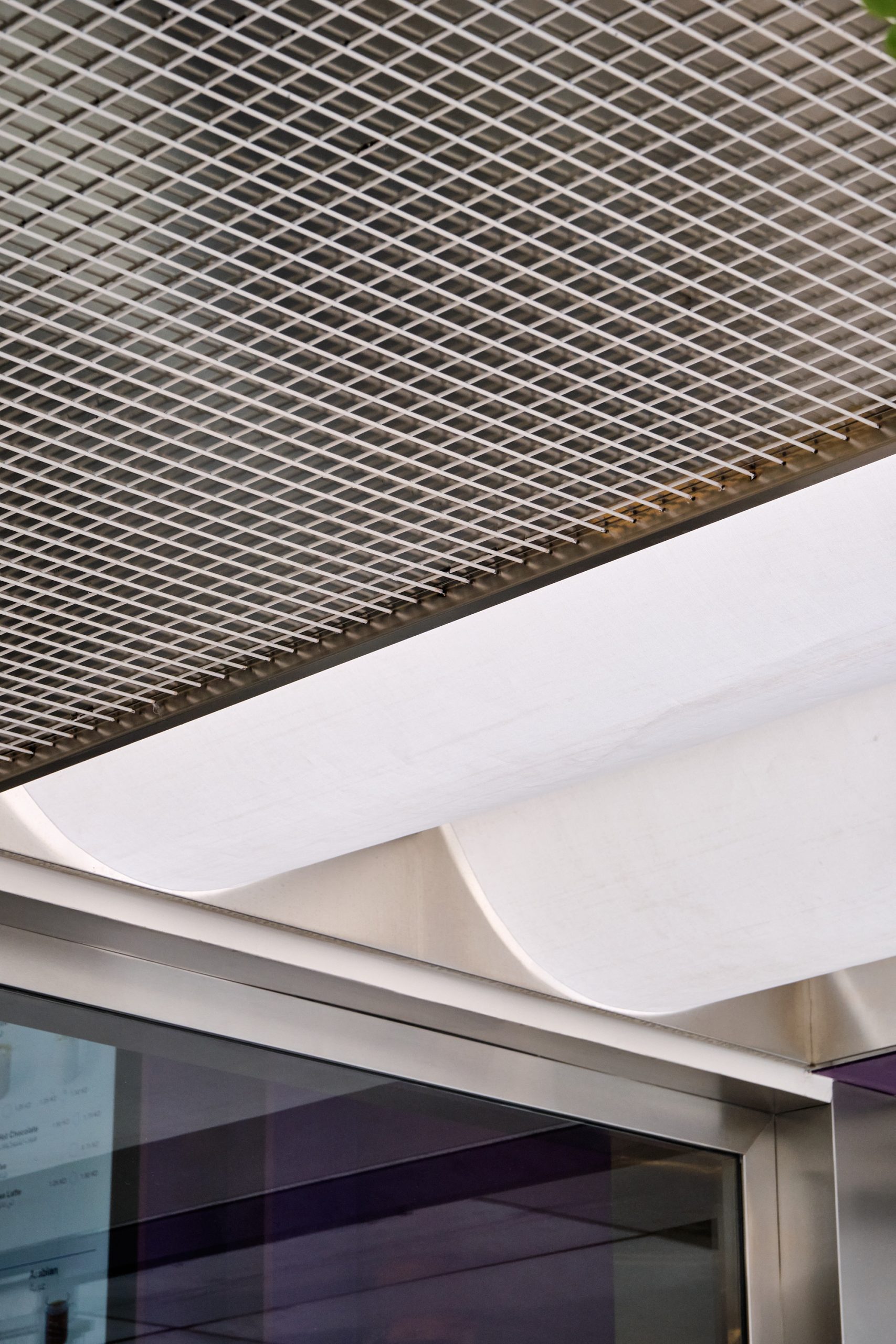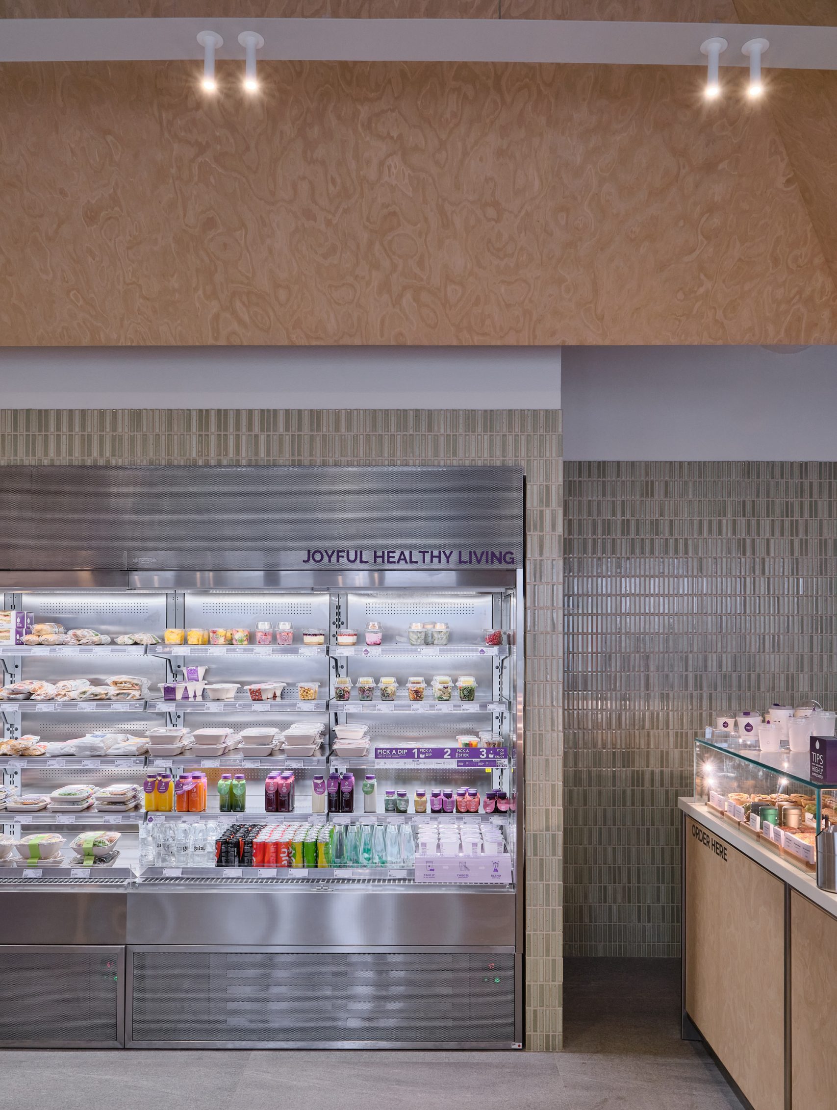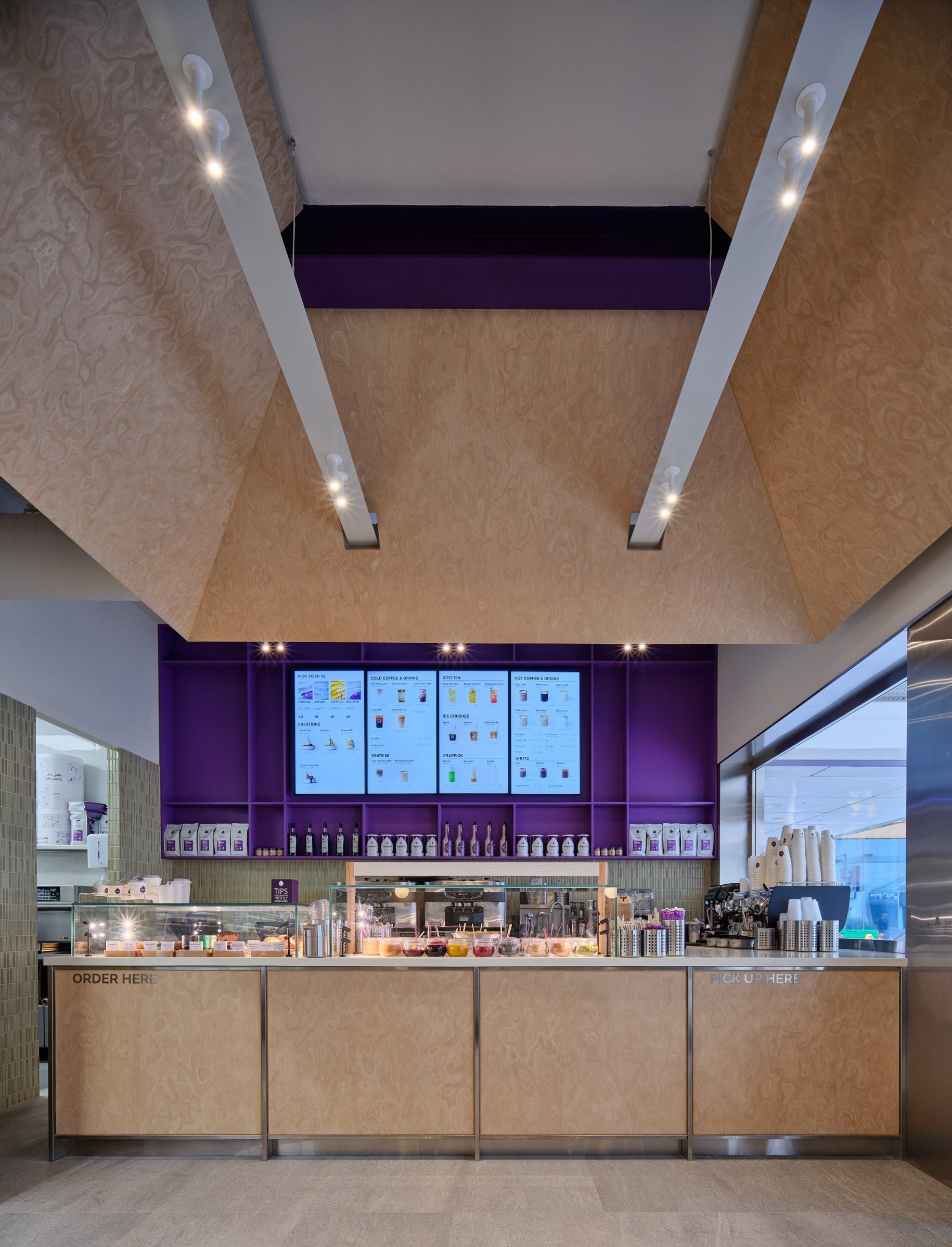 Inside, the design balances brand familiarity with clarity. Purple is used selectively to highlight structural elements and frame the menu wall, while lighter tones soften the seating. Green is introduced through the wall Japanese glazed tiles and planting, reinforcing the brand’s association with freshness. A restrained palette of wood veneer and stainless steel creates a contrast between warmth and precision. The layout is organized for efficiency within a compact footprint. A linear counter clearly defines ordering and pickup, while maintaining visual openness. Above, an open ceiling preserves the height of the space, while a suspended wood veneer canopy introduces a sense of scale and containment. Integrated lighting elements are embedded within this canopy, providing focused illumination over the service area and reinforcing the central axis of the interior.